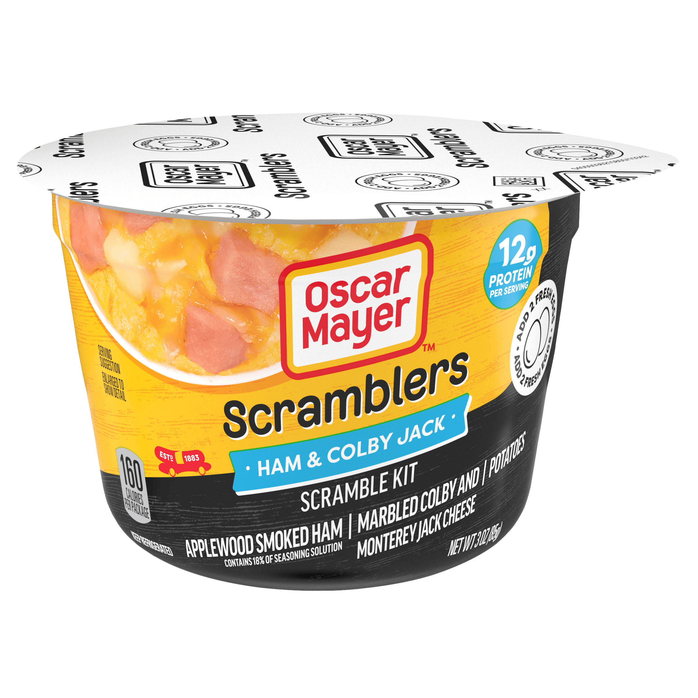 Scramble your morning with Oscar Mayer Scramblers Bacon & Velveeta Cheese Sauce Scramble Kit. Our Oscar Mayer Scramblers contains potatoes, Velveeta cheese sauce and bacon. Our scramble kit is an ideal microwave breakfast solution for on the go or at home. Our scramble kit is ready in less than two minutes. Simply add two fresh eggs, stir the ingredients and microwave for a delicious microwave breakfast solution on the go or at home. Our Scramble Kit is an excellent source of protein with 12 grams of protein per serving. Keep our single serve, 3-ounce Oscar Mayer breakfast cups refrigerated until you're ready to prepare. If you enjoy our bacon egg and cheese, try our other varieties for quick breakfast ideas.